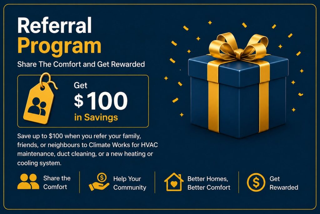 Save up to $100 when you refer your family, friends, or neighbours to Climate Works for HVAC maintenance, duct cleaning, or a new heating or cooling system.